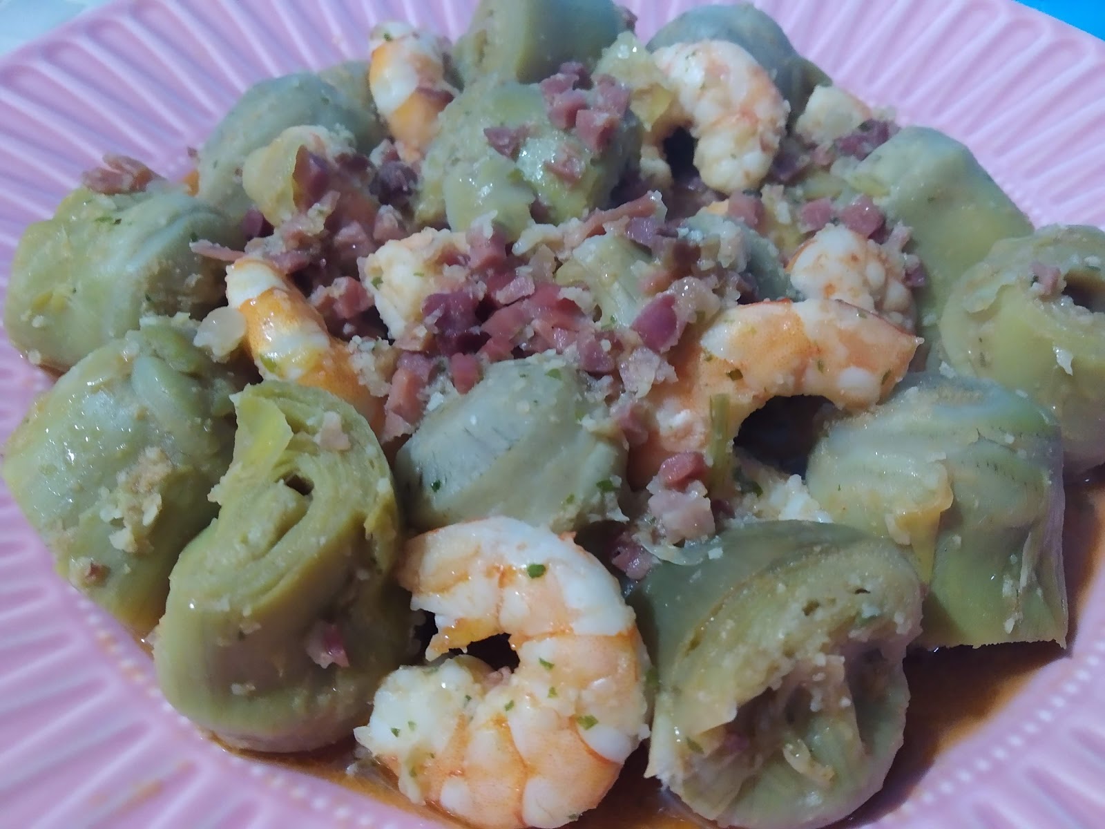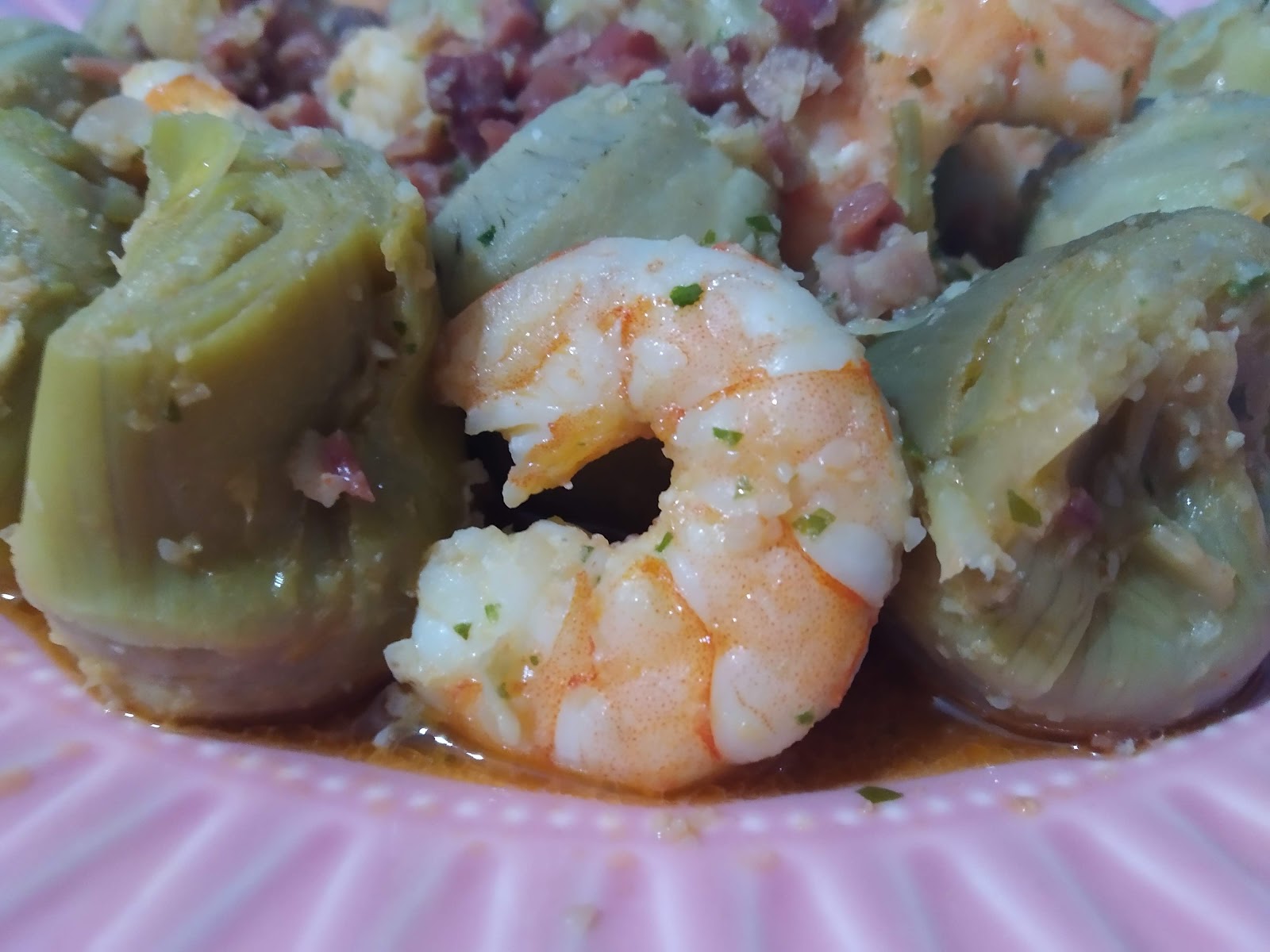 Alcachofas con langostinos y jamón | El Blog de Clara P. Villalón