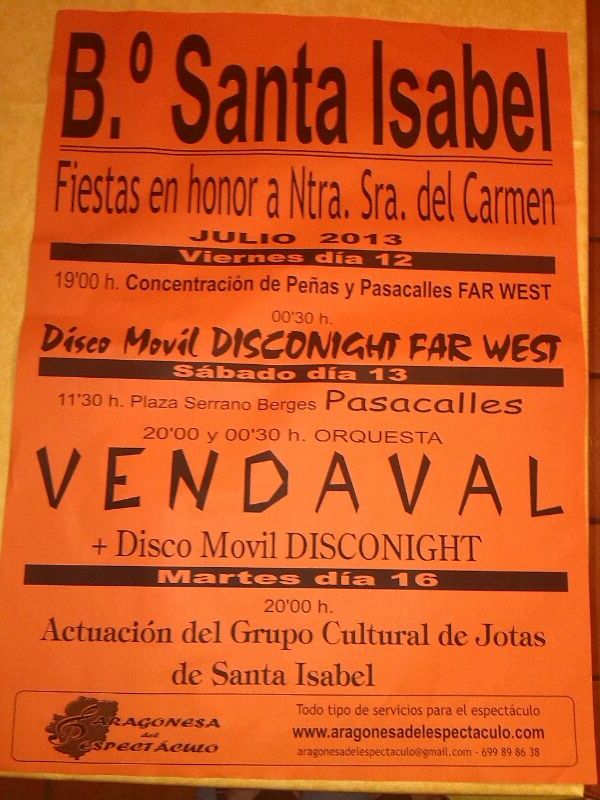 Fiestas Santa Isabel Zaragoza 2022. WebFiestas del 21 al 26 de agosto de 2023. El zaragozano barrio de Santa Isabel celebra el del miércoles 21 al lunes 26 de agosto sus fiestas de fin de verano . También este barrio zaragozano celebró en julio sus fiestas en Honor a la Virgen del Carmen. A continuación,. WebDurante unos días de agosto tendremos multitud de actividades para todas las edades. Os detallamos las infantiles: Comienzan el miércoles 24 por la tarde con el pregón y el. .
