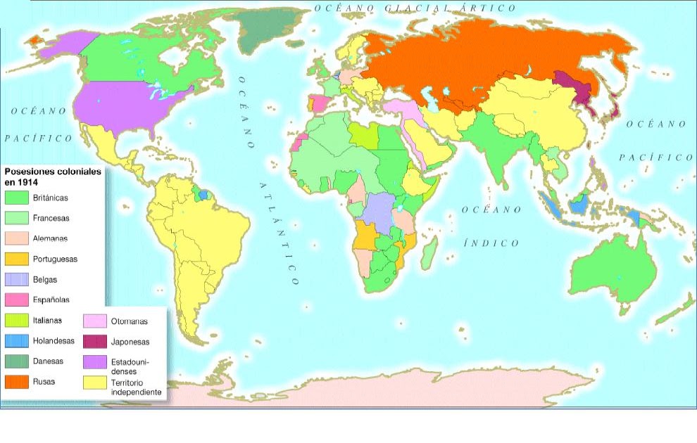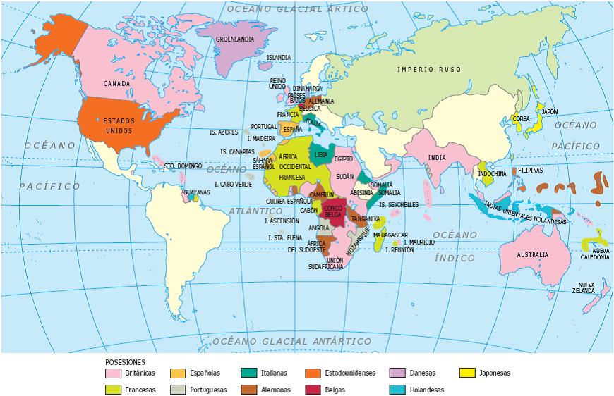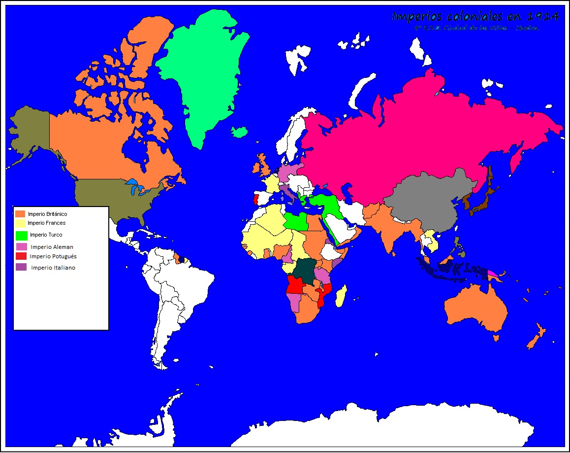 WebMapa de los principales imperios a nivel mundial . Fechado en 1914 e instrucciones para comentarlo: introducción, análisis, contesto histórico y comentario. ... Mapa histórico El. WebMapa de los imperios coloniales europeos en 1914. A lo largo del siglo XIX las potencias europeas habían protagonizado una impresionante expansión colonial. Su presencia en. WebEn 1914 Rusia solo aumenta en 0,4 millones de km2 respecto a 1876 la extensión de sus colonias, sin embargo prácticamente duplica los datos anteriores con la. WebUsuario de Brainly. Los Imperios coloniales se desarrollaron de 1870 a 1914, esta fecha no es la fecha donde se independizaron estas colonias si no que quiere decir. WebRecursos educativos (Mapa Interactivo): Imperios Coloniales () - Ubica los países imperialistas y sus colonias. Inicia sesión Crear actividad. ... Obtén ahora tu licencia. WebRepaso mapa "los imperios coloniales en 1914". Repasando el estudio del mapa de los imperios coloniales podéis intentar oralmente en casa reconocer estas colonias, decir. WebColonias en 1914. (6) Posesiones de los Imperios Coloniales (Antonio Ramiro Jimenez 4C) geología Edad recomendada: 15 años. 365 veces realizada. WebA partir de 1875 una serie de crisis conmociona el mapa de los Balcanes. En 1914, la parte europea del imperio otomano se limita al este de Tracia. ... En 1914, los imperios. WebEste mapa se sitúa en la época del imperialismo, cerca del año 1914. Muchas de las potencias a las que fueron concebidas estas tierras y fueron los principales imperios. WebVídeo 1: Cuando Europa conquistó el mundo Cuestiones : 1. ¿Qué es el imperialismo? 2. ¿De qué fenómeno es el imperialismo una consecuencia d... La.