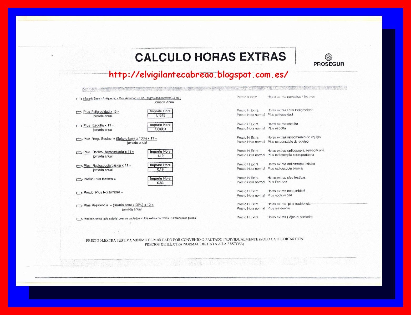 WebCálculo de horas extraordinarias. El cálculo de las horas extras trabajadas en España, se realiza adicionando un recargo del 75% al valor que tiene la hora ordinaria. En este. WebSeguridad privada TABLA PRECIO HORA EXTRA 2021. Fecha: 2 octubre, 2020 Autor/a: FeSMC UGT INV Vigilancia 0 Comentarios. Pincha AQUÍ para descargar. WebSindicat de Treballadors de Seguretat de Catalunya. CÁLCULO HORAS EXTRAS VS 2022 WebInformación para el calculo del valor de la hora extra de cada VS. según sentencia del Tribunal Supremo para la determinación calculo del valor de la hora. WebLa información salarial procede de 2 fuentes conseguidas de manera directa de las compañías, usuarios y trabajos en Indeed en los últimos 36 meses.7 sept 2023.