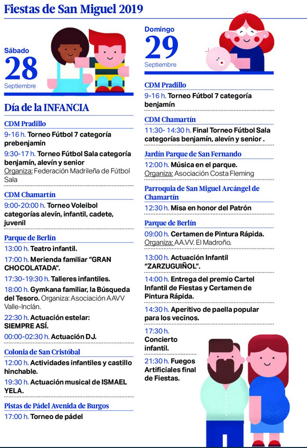 Programa Fiestas San Miguel Chamartin 2022. WebFiestas de Chamartín 2022: programa y conciertos. Del 23 de septiembre al 2 de octubre del 2022 se celebrarán las fiestas de Chamartín y tendrán el Parque de. WebDel 23 de septiembre al 2 de octubre el barrio celebra San Miguel. Madrid 27 de septiembre del 2022 a las 09:00. Actualizada a las 12:50. Las fiestas de Chamartín en. WebDel 23 de septiembre al 2 de octubre, Chamartín celebra las Fiestas de San Miguel 2022 con un programa familiar e inclusivo. Así, tras 2 años de ausencia por la..