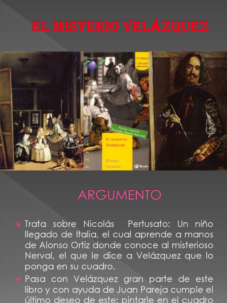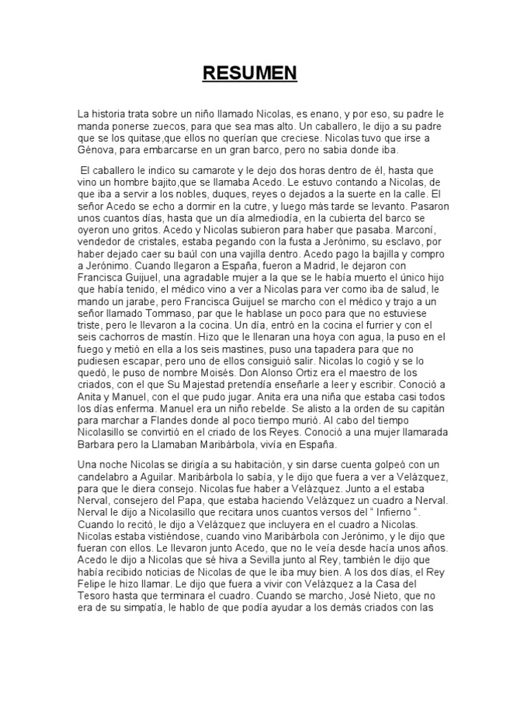 Resumen Del Misterio De Velazquez. WebCapitulo 1. Nicolás Pertusato, apodado Nicolino en su tierra de origen (Italia), recuerda con temerosidad y con entusiasmo a la vez los motivos de su marcha hacia España. En aquellos tiempos, en los que Nicolino vivía con su padre a la edad de siete años, un. WebEl misterio velazquez (resumen por capitulos) Páginas: 11 (2736 palabras) Publicado: 5 de mayo de 2011. 1ª PARTE. Capitulo 1. Nicolás Pertusato nace en..